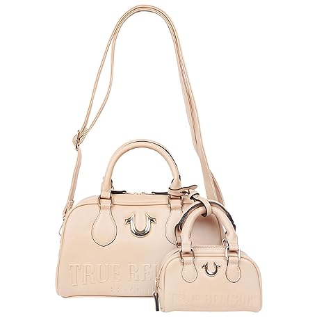 True Religion Satchel Bag, Logo Embossed Structured Purse with Matching Mini Bag, Metallic Horseshoe Emblem and Gold Hardware, Camel