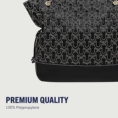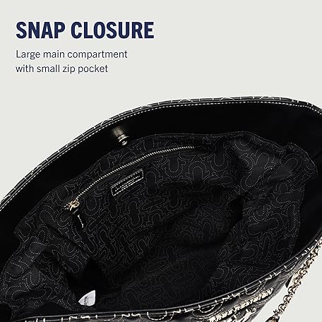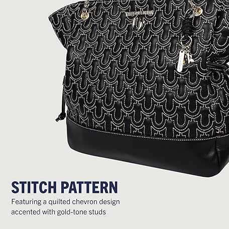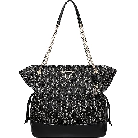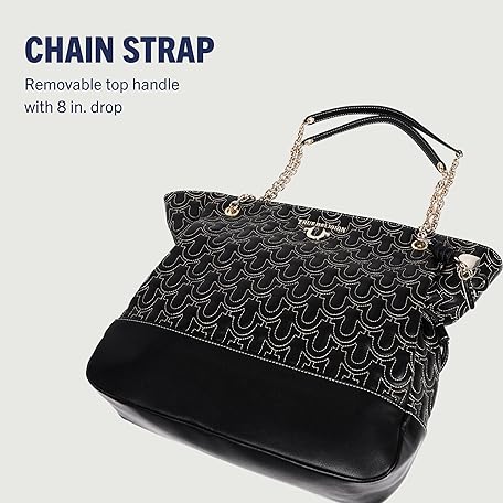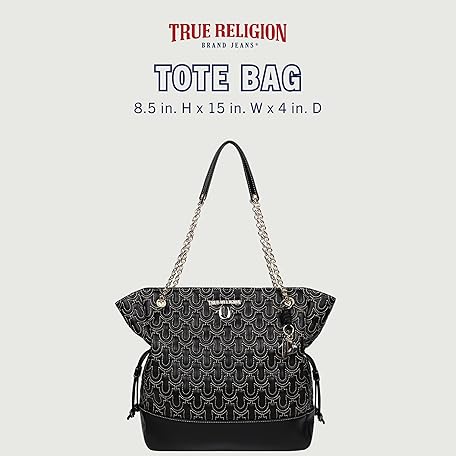 True Religion Tote Bag, Cinch Side Soft Logo Purse with Horseshoe Stitch Pattern, Chain Straps and Gold Hardware, Black