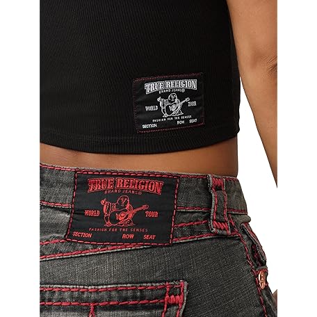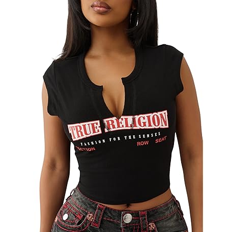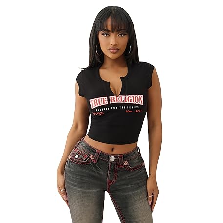 True Religion Women's Anniversary Notched SS Rib Tee – Fitted Ribbed Knit T-Shirt