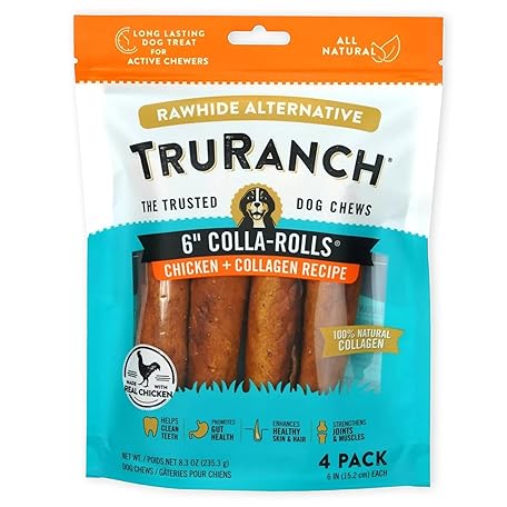 TRURANCH Collagen Rolls - 6" Collagen Rolls for Dogs - Long Lasting Healthy Joint Support Dog Treat - Rawhide Alternative - Skin & Coat Health - Made with Real Chicken, 1 Bag, 4 Count