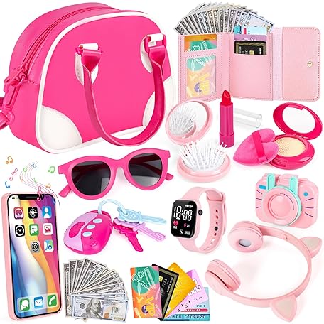 TSDATOWR Play Purse for Little Girls, Toddler Purse Accessories with Pretend Play Headset, Handbag, Toy Phone, Wallet, Kids Pretend Makeup Birthday Christmas Princess Gifts Toys for Girls