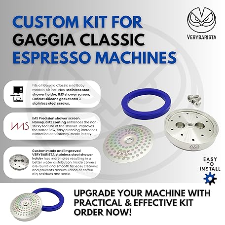 Thương hiệu verybarista là cái tên nổi tiếng được rất nhiều khách hàng trên thế giới chọn lựa. Với kiểu dáng đẹp mắt, sang trọng, sản phẩm Tune Up kit Made for Gaggia Classic. Upgraded Stainless Steel Shower Holder. IMS Precision Nanotech Shower Screen GA200NT, Cafelat Silicone Gasket and All Screws (Custom Tune Up Kit) là sự lựa chọn hoàn hảo nếu bạn đang tìm mua một món cho riêng mình.