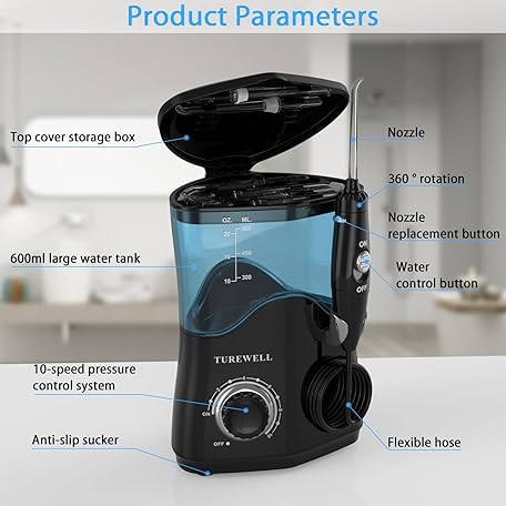 Thông tin sản phẩm TUREWELL Water Dental Flosser for Teeth/Braces, Water Teeth Cleaner 8 Jet Tips and 10 Pressure Levels, 600ML Large Water Tank Oral Irrigator for Family(Black)