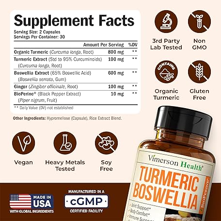 Thương hiệu Vimerson Health là cái tên nổi tiếng được rất nhiều khách hàng trên thế giới chọn lựa. Với kiểu dáng đẹp mắt, sang trọng, sản phẩm Turmeric Curcumin Supplement with Boswellia Serrata, Ginger Root, Organic Turmeric Powder & Black Pepper - 95% Curcuminoids Turmeric Supplement - 60 Gluten Free Tumeric Boswellia Extract Capsules là sự lựa chọn hoàn hảo nếu bạn đang tìm mua một món cho riêng mình.