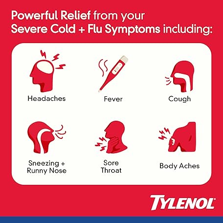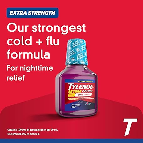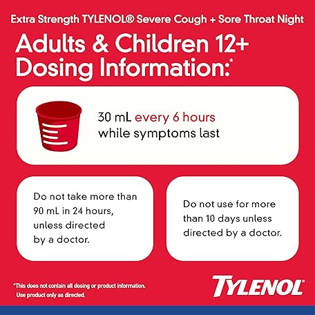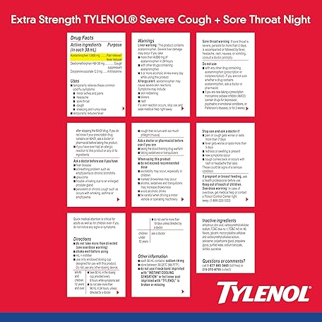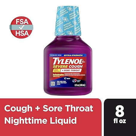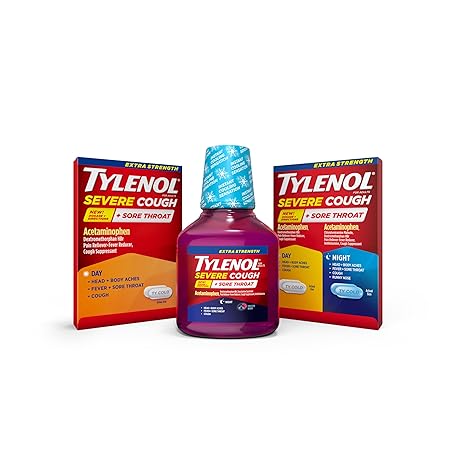 Thông tin sản phẩm Tylenol Extra Strength Severe Cough + Sore Throat Nighttime Liquid Cold Medicine, Multi-Symptom Cold Relief, Acetaminophen Pain Reliever, Dextromethorphan HBr, Doxylamine Succinate, 8 Oz.