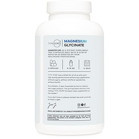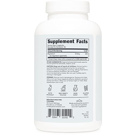 Thông tin sản phẩm Type Zero Magnesium Glycinate (210mg | 180 Capsules) Pure, Non-GMO, Gluten Free, Natural High Absorption Magnesium Supplement