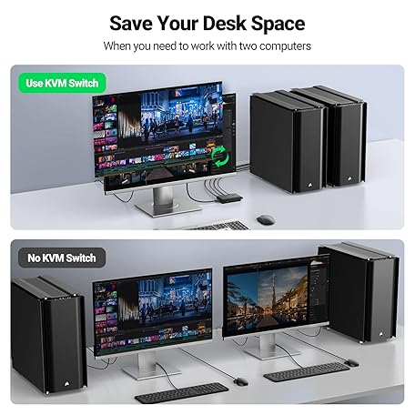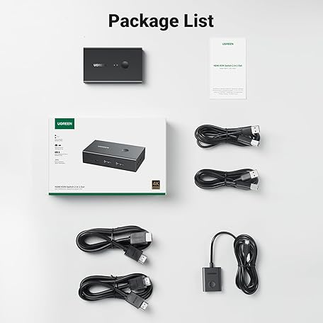 Thông tin sản phẩm UGREEN HDMI KVM Switch 1 Monitor 2 Computers, with 4 USB Ports 4K@60Hz KVM Switches for Sharing One Monitor Keyboard Mouse Printer with 2 HDMI Cables, 2 USB Cables, Desktop Controller