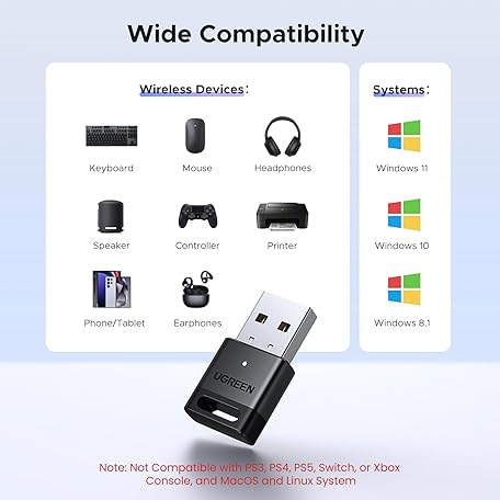 UGREEN USB Bluetooth Adapter for PC Bluetooth 5.4 Dongle Receiver EDR & BLE, Plug & Play Supports Windows 11/10/8.1, for Desktop, Laptop, Headphone,Keyboard,Mouse, Speakers,Printer