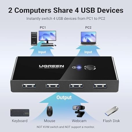 Thương hiệu UGREEN là cái tên nổi tiếng được rất nhiều khách hàng trên thế giới chọn lựa. Với kiểu dáng đẹp mắt, sang trọng, sản phẩm UGREEN USB Switch Selector 2 Computers Sharing 4 USB Devices USB 2.0 Peripheral Switcher Box Hub for Mouse Keyboard Scanner Printer PCs with One-Button Swapping and 2 Pack USB A to A Cable là sự lựa chọn hoàn hảo nếu bạn đang tìm mua một món cho riêng mình.