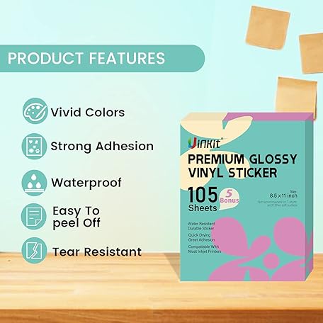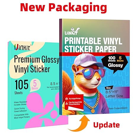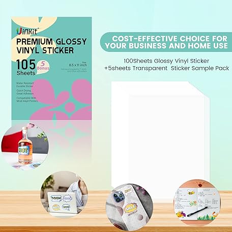 Thông tin sản phẩm Uinkit 105 Sheets Premium Printable Vinyl Sticker Paper for Inkjet Printer Cricut,included 100Sheets Glossy and 5Sheets Transparent Label Waterproof Adhesive Dries Quickly Tear-Resistant, Removable