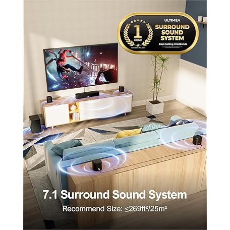 Thông tin sản phẩm ULTIMEA 7.1ch Virtual Surround Sound Bar, Sound Bar for Smart TV with 4 Surround Speakers, Peak Power 330W, Surround Sound System for TV, App Control, TV Soundbar with Subwoofer, Opt/AUX/BT, Aura A40