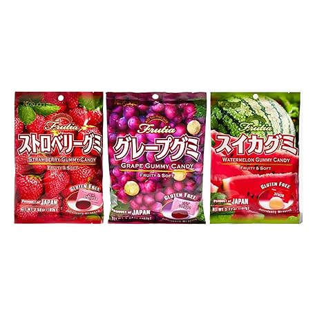Thông tin sản phẩm UMAYA - Kasugai Fruita Gummies - Japanese Fruity & Soft Gummy Candy 3 Pack Bundle With A Snack Bag Clip - One Pack Of Each Flavor - Strawberry (3.59oz), Grape (3.77oz), & Watermelon (3.77oz)