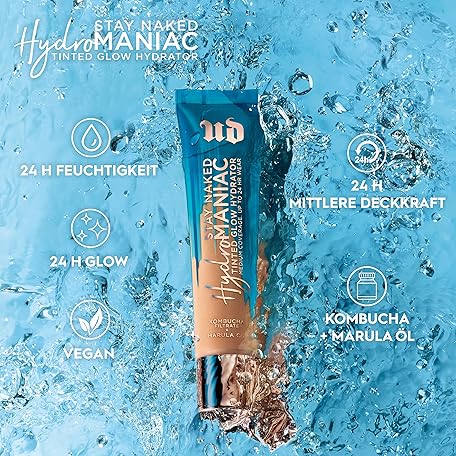 Thông tin sản phẩm Urban Decay Hydromaniac Dewy Foundation, Hydrating Tinted Moisturizer for Dry Skin, Buildable Medium Coverage, with Kombucha Filtrate & Marula Oil, Non-comedogenic, Vegan, Cruelty-free - 1.1 fl oz