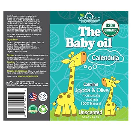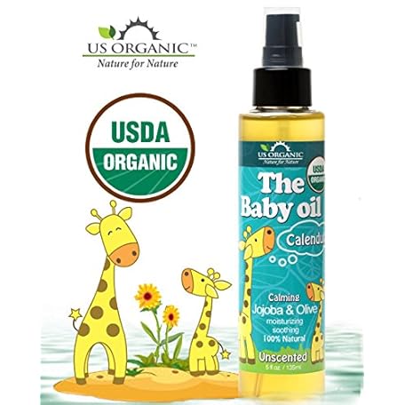 Thông tin sản phẩm US Organic Baby Oil with Calendula, Jojoba, and Olive Oil with Vitamin E, USDA Certified Organic, No Alcohol, Paraben, Artificial Detergents, Color, Synthetic Perfumes, 5 fl. Oz (Pure Unscented)