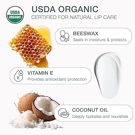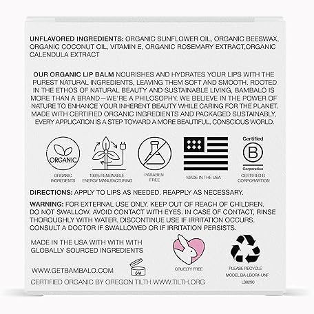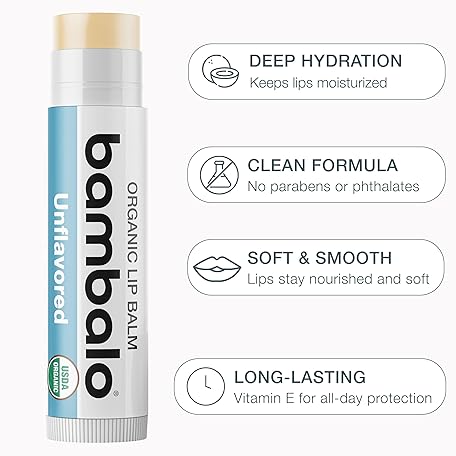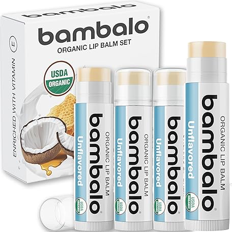 USDA Organic Lip Balm Unflavored 4-Pack by Bambalo – Beeswax, Coconut Oil, Vitamin E – Gentle Lip Repair Chapstick for Dry Lips – Moisturizing Care for Men and Women