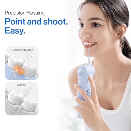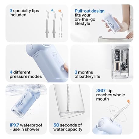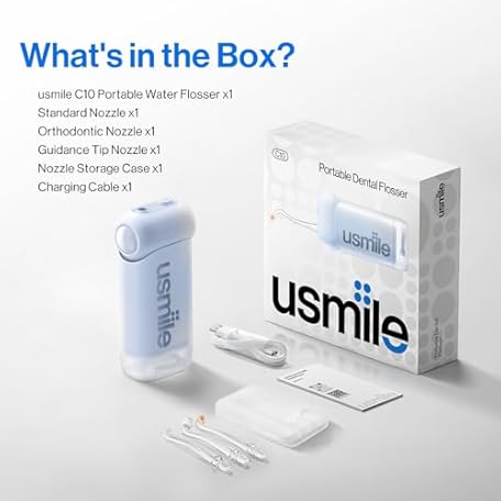 Thông tin sản phẩm usmile C10 Portable Water Flosser – Travel-Friendly, 95-Day Battery, 4 Modes, 360° Nozzle, 180ml Tank, IPX7 Waterproof, Dentist-Recommended for Braces, Implants & Sensitive Gums (Blue)