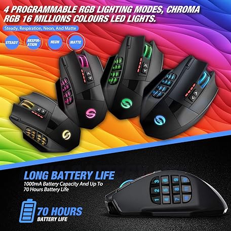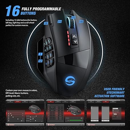 Thông tin sản phẩm UtechSmart Venus Pro RGB Wireless MMO Gaming Mouse, 16,000 DPI Optical Sensor, 2.4 GHz Transmission Technology, Ergonomic Design, 16M Chroma RGB Lighting, 16 programmable Buttons, Up to 70 Hours