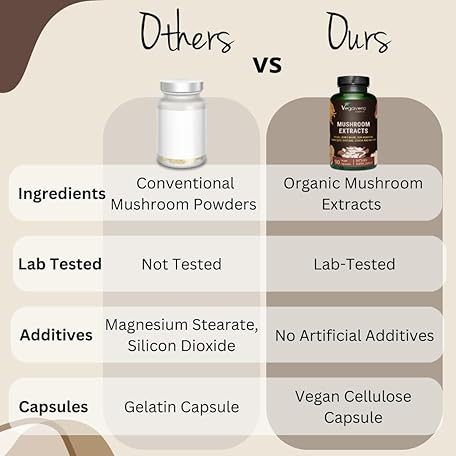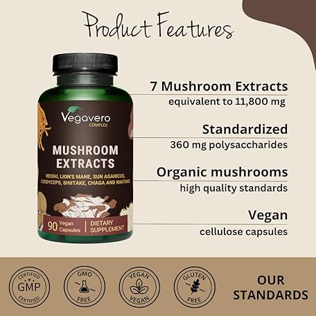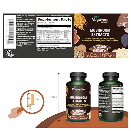 Vegavero Organic Mushroom Supplement | 11,800mg | Lion Mane, Reishi, Cordyceps | Nootropic + Natural Immune Support | 90 Capsules