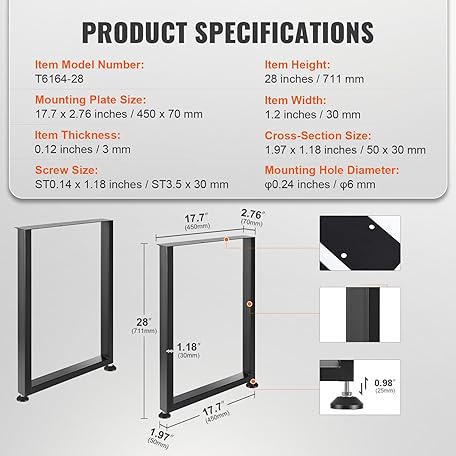 Thông tin sản phẩm VEVOR 28 Inch Adjustable Furniture Legs, Square Reinforced Steel Office Table Legs Set of 2 for DIY, Max Load 1000 lbs Heavy Duty Desk Legs, Quick Instalation & Rich Accessories Legs Black
