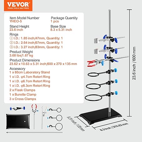 VEVOR Lab Stand Support, Laboratory Retort Support Stand Set, Steel Lab Stand 23.6" Rod and 8.3" x 5.7" Cast Iron Base, Includes Flask Clamps, a Burette Clamp and Cross Clamps