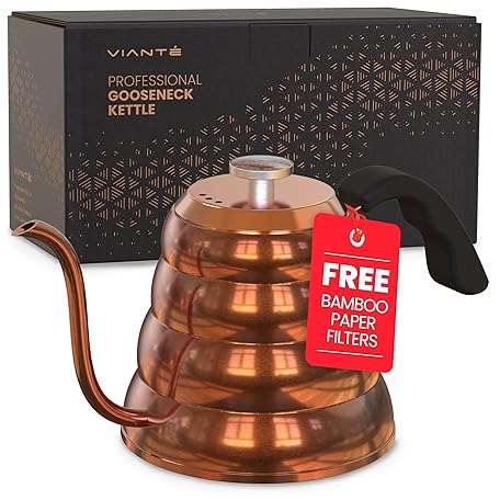 Sản phẩm Vianté Gooseneck Stovetop Pour Over Coffee Kettle with Thermometer for Drip Coffee and Tea. Premium Copper Stainless Steel. 40 fl oz. All Coocktops. đang được bán với giá ưu đãi là $59.9391 tại nước Mỹ.