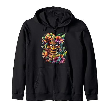 Vibrant Hawaiian Tiki Mask Tropical Floral Zip Hoodie