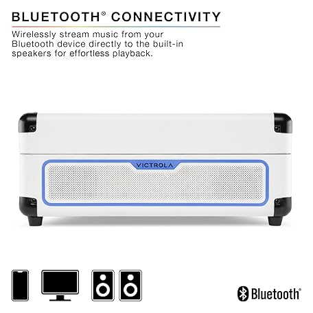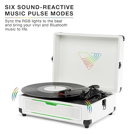 Thông tin sản phẩm Victrola Journey Glow – Illuminated Suitcase Record Player – 18 RGB Light Effects, Stereo Speakers with Enhanced Bass, Bluetooth Streaming, (White)