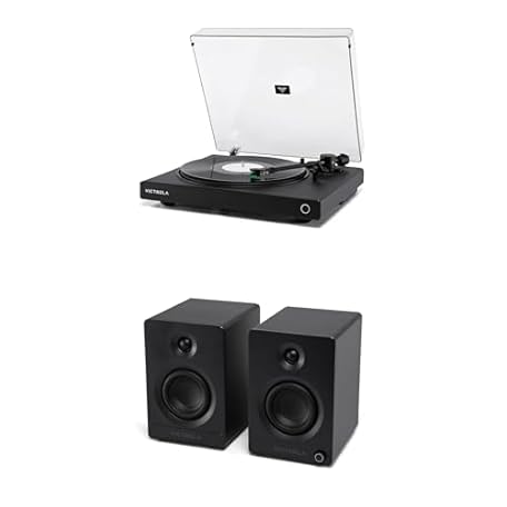 Victrola Wave – Bluetooth Turntable with Auracast – 2-Speed Vinyl Record Player & Victrola Tempo – Bluetooth Bookshelf Speakers – Room-Filling Sound (Bundle, Black)