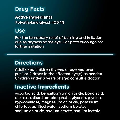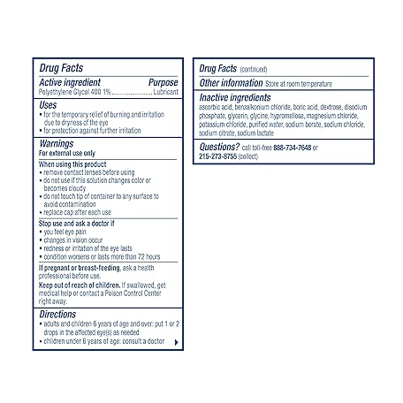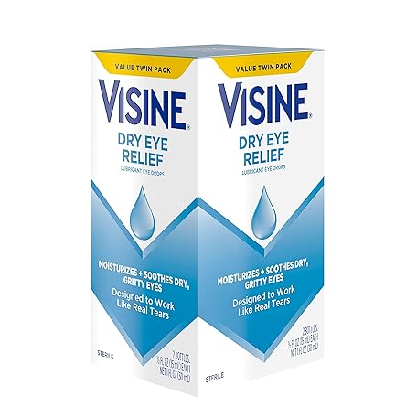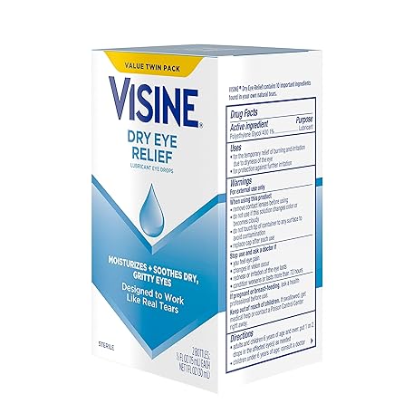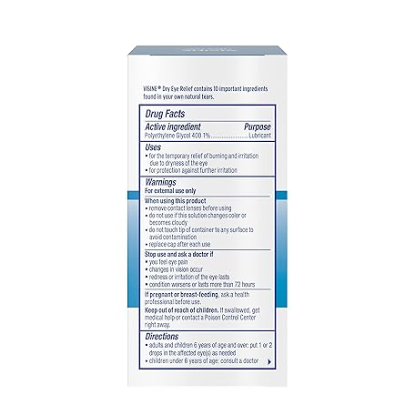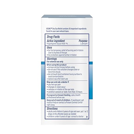 Thông tin sản phẩm Visine Dry Eye Relief Lubricant Eye Drops to Moisturize and Soothe Irritated, Gritty and Dry Eyes, Designed to Work Like Real Tears, Polyethylene Glycol 400, 0.5 fl. oz, 2 Pack