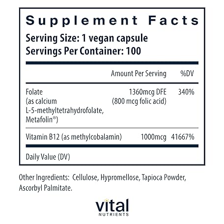 Thông tin sản phẩm Vital Nutrients Vitamin B12 & Methyl Folate | Vegan Methylated Folate & B12 Supplement | 5-MTHF Plus B12 Supports Nervous System & Metabolism* | Gluten, Dairy, Soy Free | 100 Capsules