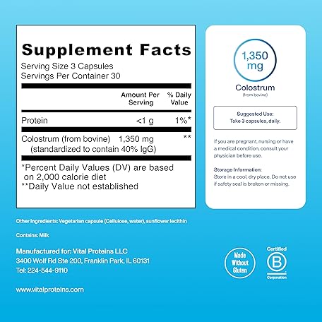 Thông tin sản phẩm Vital Proteins Bovine Colostrum Supplement 90 Capsules for Gut Health, Immune Support with 40% IgG Premium Bovine Colostrum Superfood, Unflavored, 30 Servings