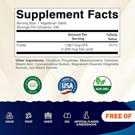 Sản phẩm Vitamatic Folic Acid 1000 mcg (1 mg) – 240 Vegetarian Tablets (Pack of 2) 1667 mcg DFE – Vitamin B9 for Prenatal, Heart & Cellular Health đang được bán với giá ưu đãi là $20.6991 tại nước Mỹ.