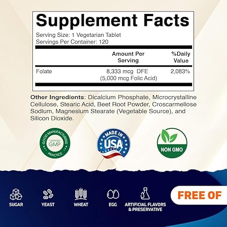 Sản phẩm Vitamatic Folic Acid 5mg (5000 mcg) – 120 Vegetarian Tablets High Potency Vitamin B9 (Folate) for Cellular Health, Heart Support & Prenatal Care đang được bán với giá ưu đãi là $10.8891 tại nước Mỹ.