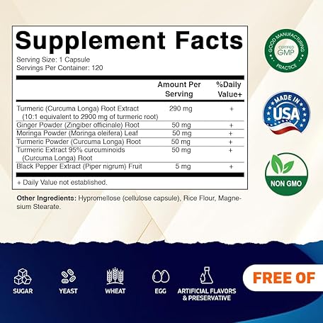 Thông tin sản phẩm Vitamatic Turmeric Curcumin Supplement (10:1 Equivalent 3000 mg Per Serving, Made with 95% Curcuminoids, Black Pepper, Ginger, Moringa) 120 Vegetable Capsules, Non-GMO, Gluten Free (120 Capsules)