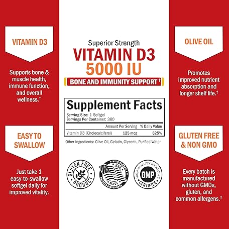 Thông tin sản phẩm Vitamin D3 5000 IU (125 mcg) Natural Immune Support Supplement, Bone Strength, Healthy Muscle Function, with Olive Oil for Highest Absorption, Gluten Free & Non-GMO, 1 Year Supply, 360 Softgels