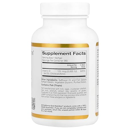 Thương hiệu California Gold Nutrition là cái tên nổi tiếng được rất nhiều khách hàng trên thế giới chọn lựa. Với kiểu dáng đẹp mắt, sang trọng, sản phẩm Vitamin D3, 5,000IU, Cholecalciferol from Lanolin, 125 mcg, 360 Fish Gelatin Softgels là sự lựa chọn hoàn hảo nếu bạn đang tìm mua một món cho riêng mình.
