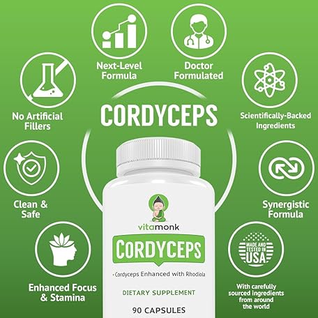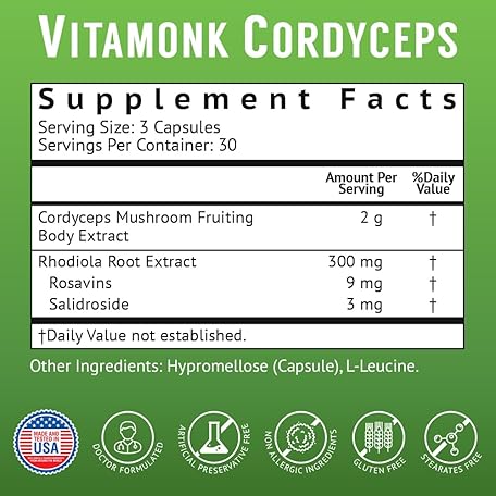 Thông tin sản phẩm VitaMonk Cordyceps Mushroom Capsules with Rhodiola, 2 Grams of Cordyceps Mushroom Enhanced with Rhodiola - Boost Energy, Fight Stress, Enhance Performance, Non-GMO - 2000mg - 90 Caps