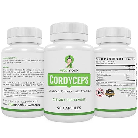 Sản phẩm VitaMonk Cordyceps Mushroom Capsules with Rhodiola, 2 Grams of Cordyceps Mushroom Enhanced with Rhodiola - Boost Energy, Fight Stress, Enhance Performance, Non-GMO - 2000mg - 90 Caps đang được bán với giá ưu đãi là $17.4291 tại nước Mỹ.
