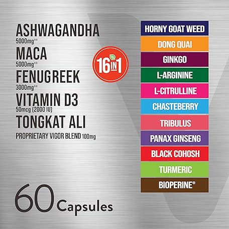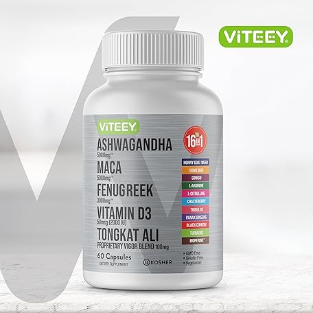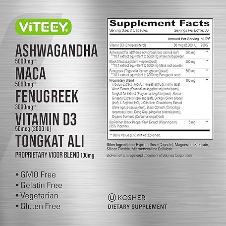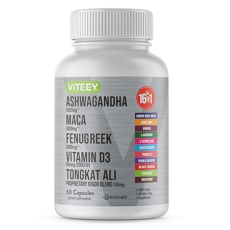 Viteey Ashwagandha Maca Fenugreek Supplement with Tongkat Ali – Drive, Passion & Energy Support for Men & Women – Mood, Calm & Stress Support - 60 Capsules