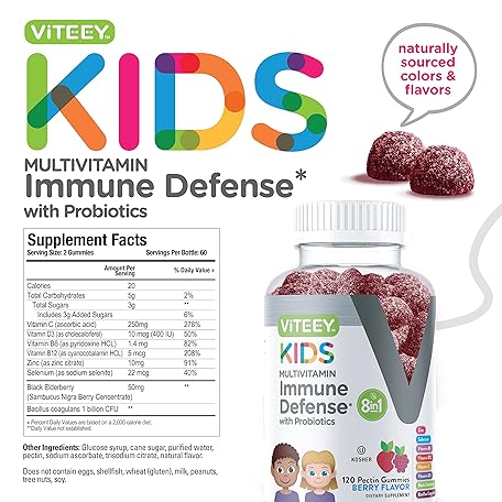 Thông tin sản phẩm Viteey Kids Multivitamin Gummies with Probiotics - 8-1 Kids Vitamins for Immune Health Support with Vitamin C, D3, B12, B6, Zinc, Elderberry, Selenium - Vegetarian - Chewable Tasty Berry Flavored