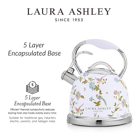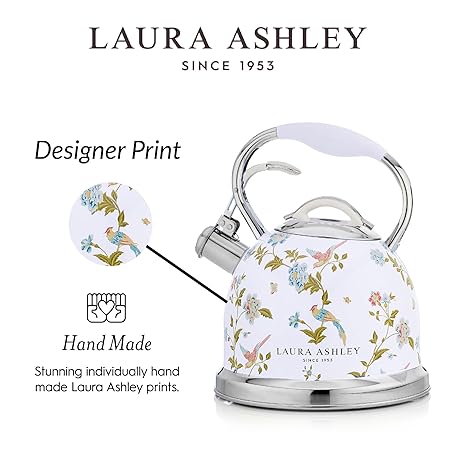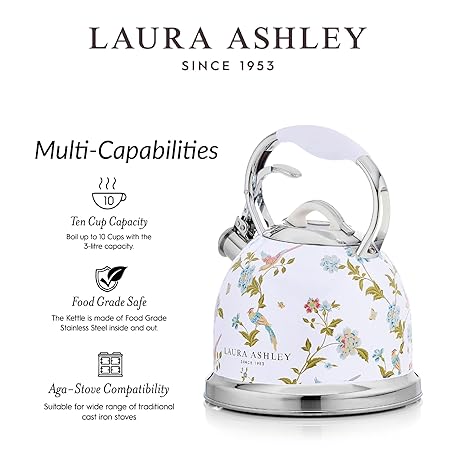 Thông tin sản phẩm VQ Laura Ashley Elveden White 3L Stainless Steel Tea Kettle Stovetop Whistling Teapot for Induction, Gas Hob or others. Silicon Coated Cool Handle & Push Button Mechanism Vintage Stove Top Kettle
