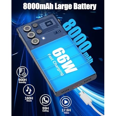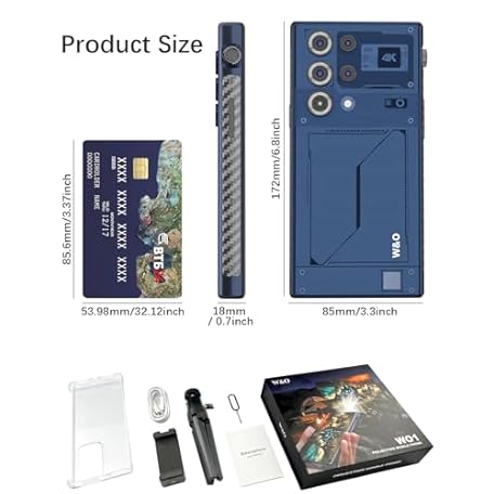 Thông tin sản phẩm W & O 5G Unlocked Smartphone, Built-in Projector & Tripod, 6.79’Android 14 Mobile Phone with Projector, 8RAM+512ROM, Dual SIM,8000mAh Battery OTG Reverse Charging, IP68, GPS & Face ID – US Compatible