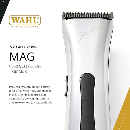 Thông tin sản phẩm Wahl Professional Sterling Mag Cordless Trimmer, Lithium Ion, Quick-Detach Blade, 120 Minute Run Time, Includes Charging Stand
