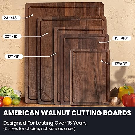 Thông tin sản phẩm Walnut Wood Cutting Board for Kitchen with Deep Juice Groove & Side Handles, 17”L x 11”W x 0.8”H, Handcrafted North American Black Walnut Wood Grain, Medium Chopping Board, Reversible Butcher Block