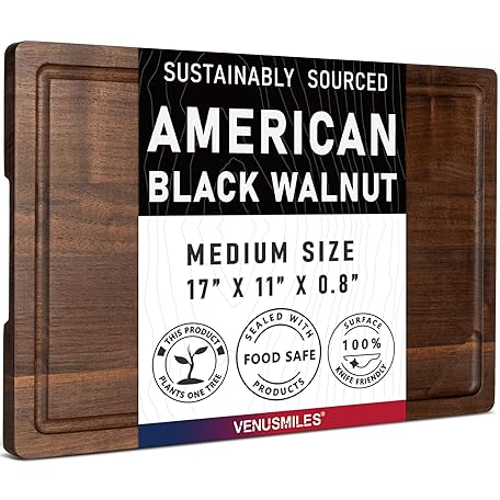 Thương hiệu Venusmiles là cái tên nổi tiếng được rất nhiều khách hàng trên thế giới chọn lựa. Với kiểu dáng đẹp mắt, sang trọng, sản phẩm Walnut Wood Cutting Board for Kitchen with Deep Juice Groove & Side Handles, 17”L x 11”W x 0.8”H, Handcrafted North American Black Walnut Wood Grain, Medium Chopping Board, Reversible Butcher Block là sự lựa chọn hoàn hảo nếu bạn đang tìm mua một món cho riêng mình.
