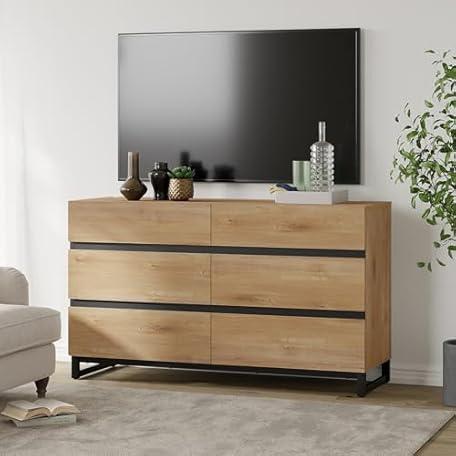 WAMPAT Modern TV Stand for TVs up to 50 inch, Wood Entertainment Center with 6 Drawers and Metal Base, Media TV Console for Living Room, Bedroom, Oak