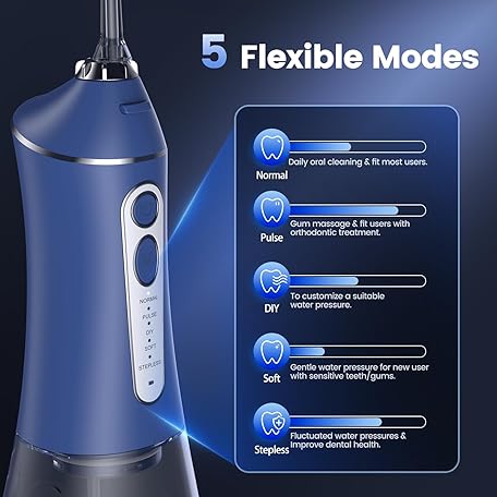 Thông tin sản phẩm Water Flosser for Teeth Cleaning and Flossing, 5 Modes Rechargeable Cordless Oral Irrigator 320ml Water Tank Teeth Cleaner, IPX7 Waterproof Portable Electric Dentel Flossers for Home and Travel,Blue