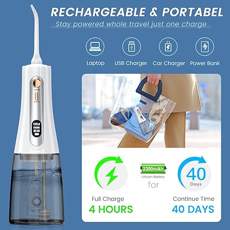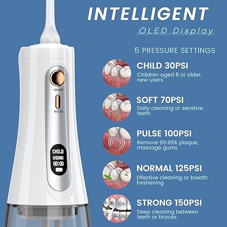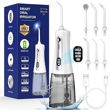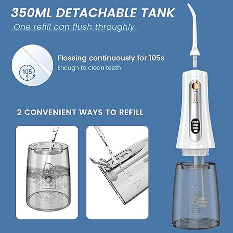 Thông tin sản phẩm Water Flosser Portable, 350ML Large Tank with 5 Pressure Settings, Cordless Rechargeable Oral Irrigator with 6 Tips, OLED Display, IPX7 Waterproof for Travel & Home Use