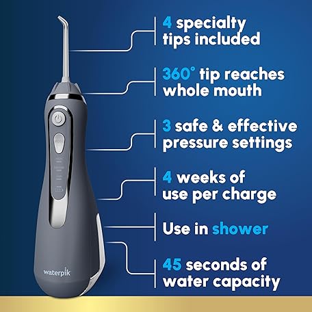 Thông tin sản phẩm Waterpik Cordless Advanced 2.0 Water Flosser For Teeth, Gums, Braces, Dental Care With Travel Bag and 4 Tips, ADA Accepted, Rechargeable, Portable, and Waterproof, Gray WP-587, Packaging May Vary