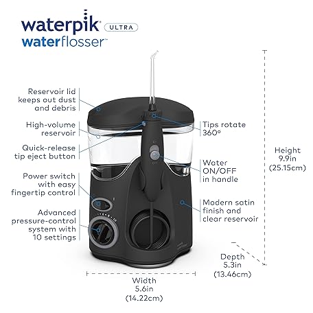 Thông tin sản phẩm Waterpik Ultra Water Flosser, Black - 90+ Seconds of Flossing Time - 10 Pressure Settings, 360-Degree Tip Rotation - Includes Six Tips & Built-in Tip Storage